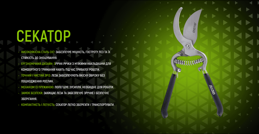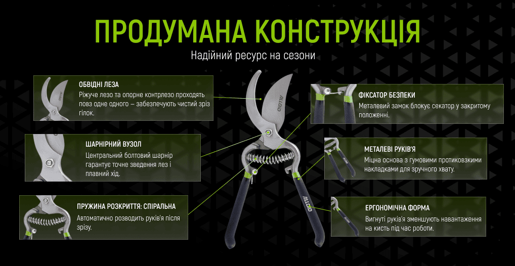- Призначення: обрізання гілок, кущів, плодових дерев та декоративних рослин